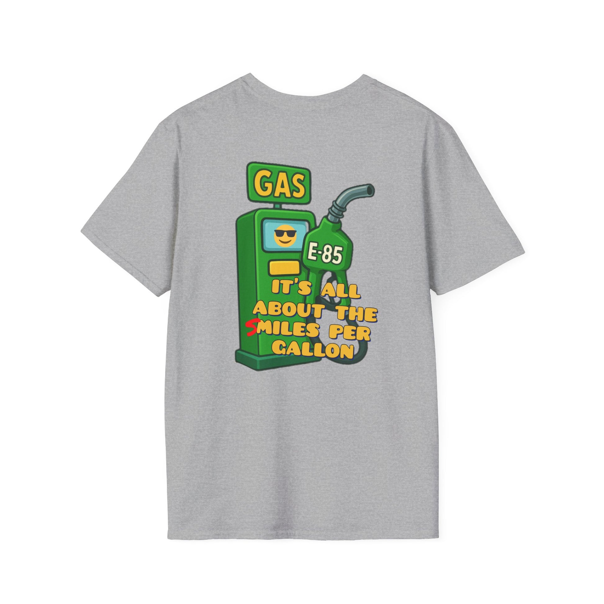 T-Shirt — "It's All About the Miles Per Gallon" Gas Pump Graphic Tee